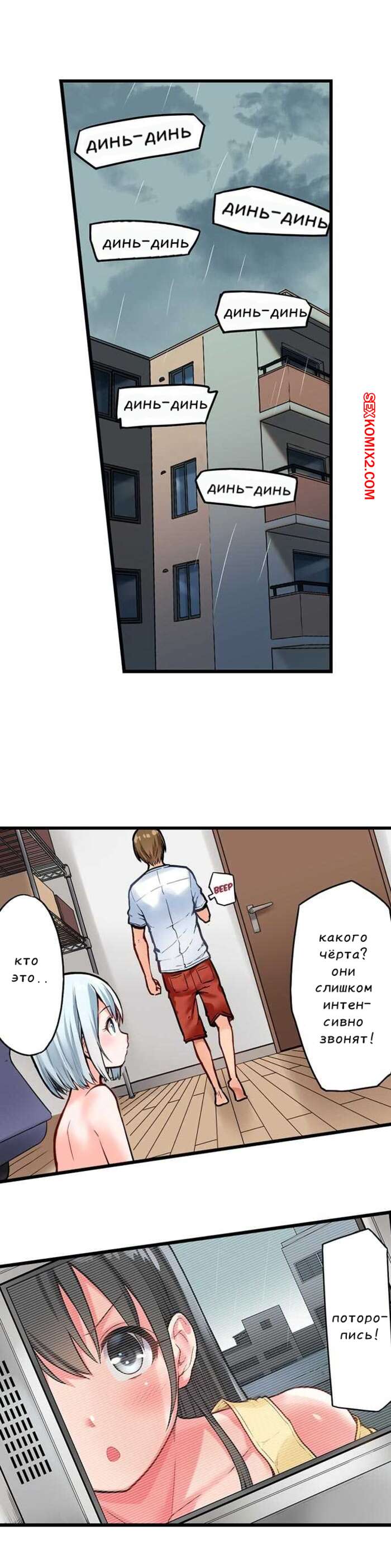 Порно комикс Спуск на землю девственной киски. Часть 4 К парню, веселившемуся со своей новой красоткой блондинкой, пришла его подруга. Он перепугался от того, что она подумает чтото не то, но все таки впустил ее к себе. Они спокойно поужинали и легли спать..