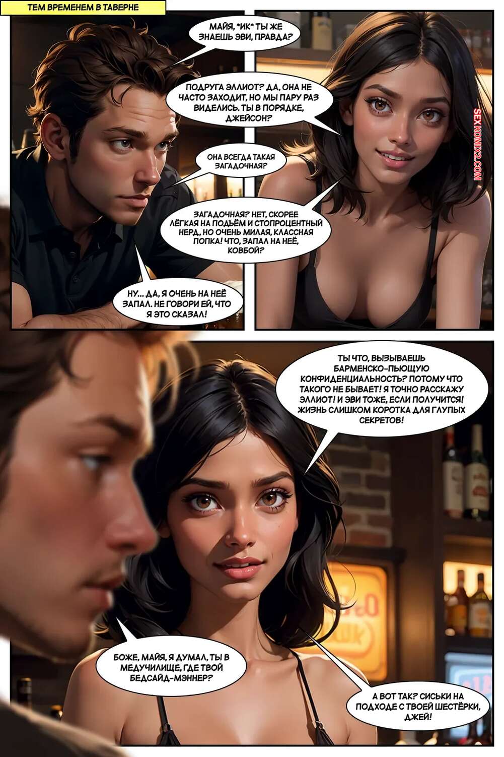 Порно комикс Генезис. Часть 5. G3nysis. G3nysis Горячая брюнетка решил немного расслабиться после тяжелого дня и сходить в бар. Красотка надела сексуальное платье и пошла в заведение, где обратила на себя взгляды парней.