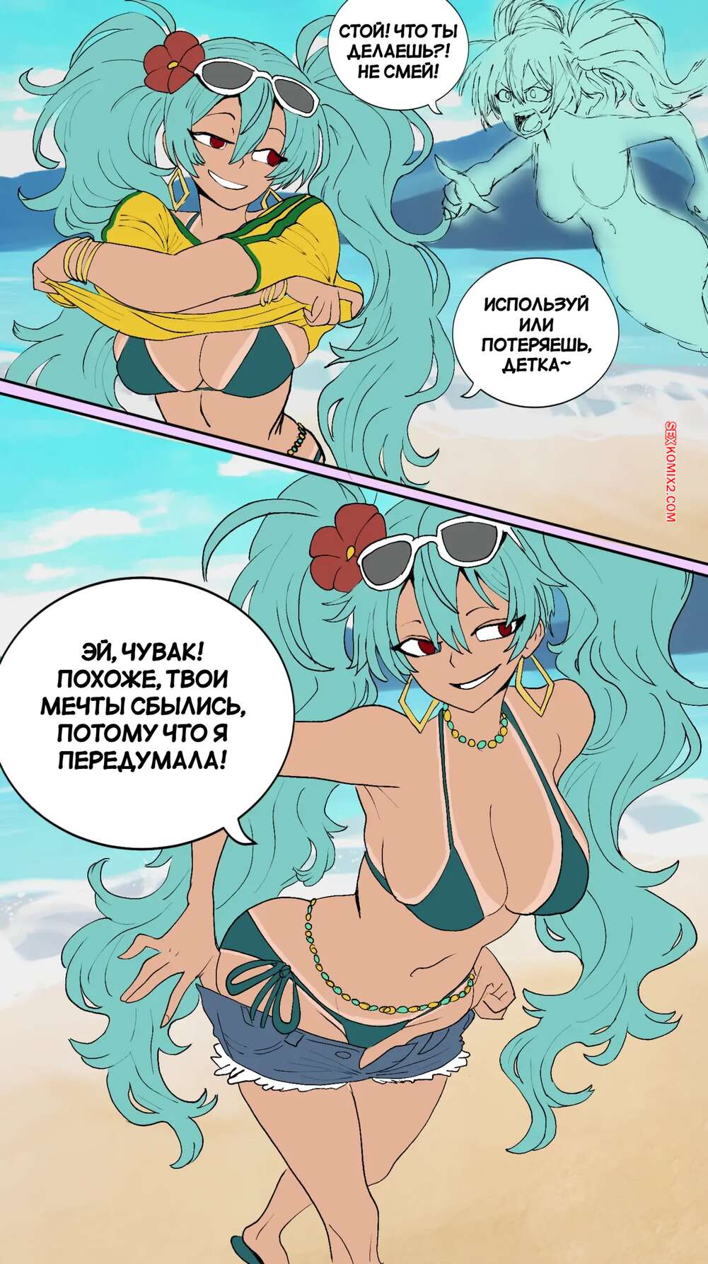 Порно комикс Мику. Miku TSF. funflo. Красотка Мику пришла на пляж, где осталась лишь в купальнике и привлекла внимание парня своим шикарным телом. Он повел девушку в уединенное место, где хорошенько ее выебал.