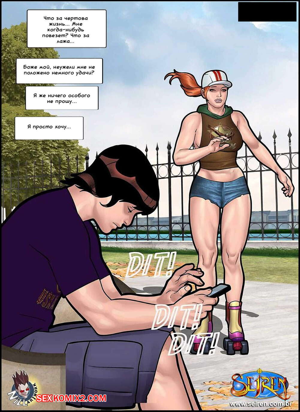 Порно комикс Спортсменка. Часть 6. Эпизоды 1 и 2 и 3 Милфа каталась на роликах и упала, а молодой паренек решил ей помочь. Сучка решила отблагодарить его и позвала к себе, где она отсосала его большой хуй и дала ему себя выебать.