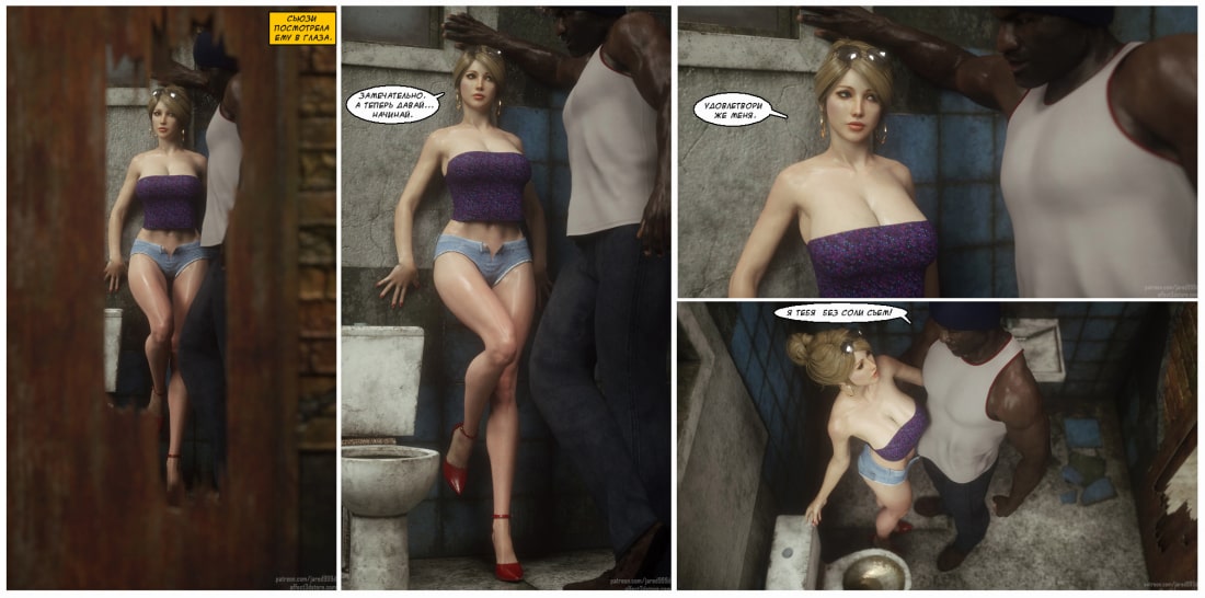 Порно комиксы 3 д. Дикарка Сью. Неуправляемая страсть. Молоденькая блондиночка гуляла по неблагополучным у району города, и зашла в тёмный переулок, где тусовались чернокожие парни. Один из парней последовал за ней, и попытался познакомиться. Девушка не была против, ведь именно для этого она туда и пришла. После недолгого диалога, девушка сама потащила парня заняться с ним сексом. Но поскольку в районе не было ничего приличного, они пошли в ближайший туалет. Который выглядел не очень-то чистым, но девушку уже ничего не могло остановить. Она была возбуждена и плавочки очень сильно намокли.