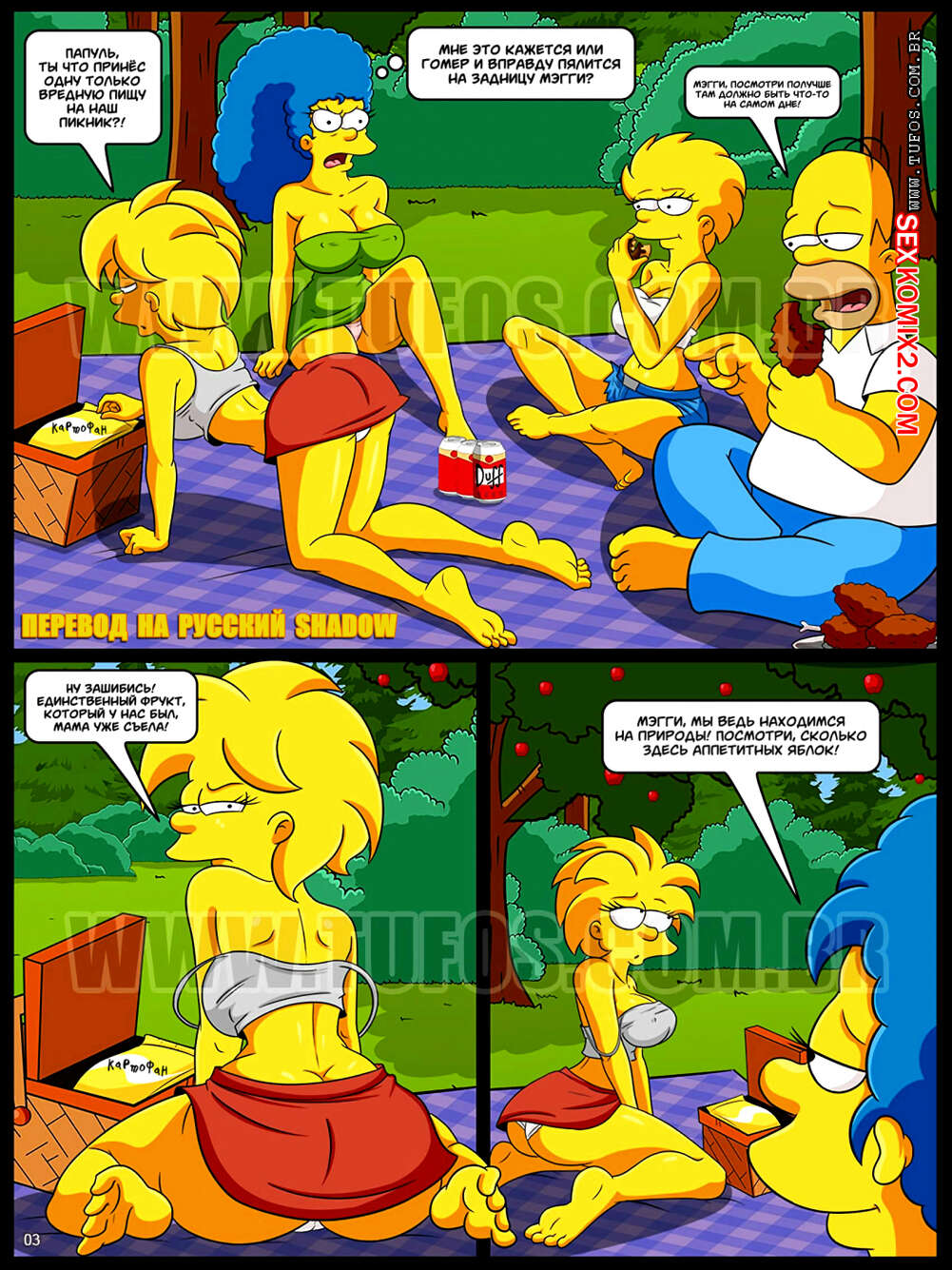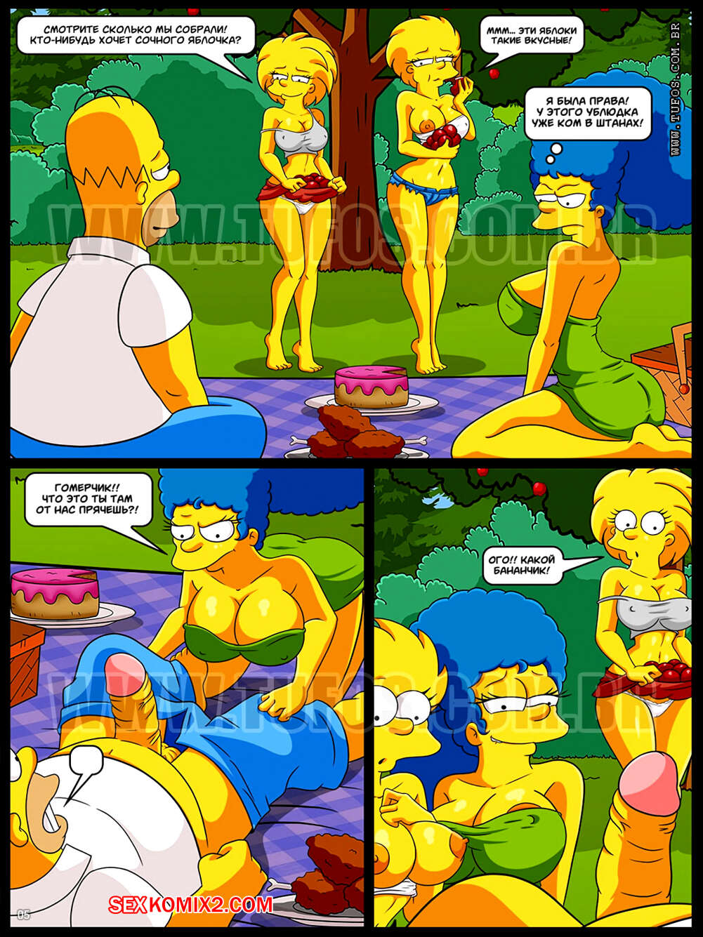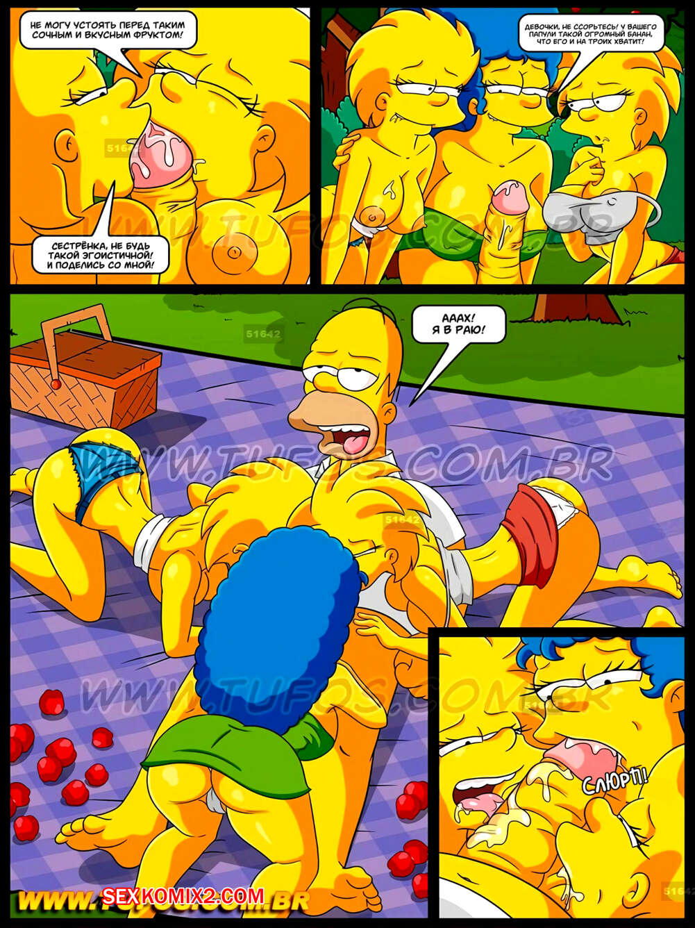 Порно комикс Симпсоны. Часть 8. Запретный плод на семейном пикнике Гомер с Мардж и двумя дочками отправились на пикник. Пока дочки отошли, Мардж решила отсосать хуй у мужа, но позже к ним присоединились их дочери, так что Гомеру невероятно повезло и он смог оттрахать три аппетитные пизденки.