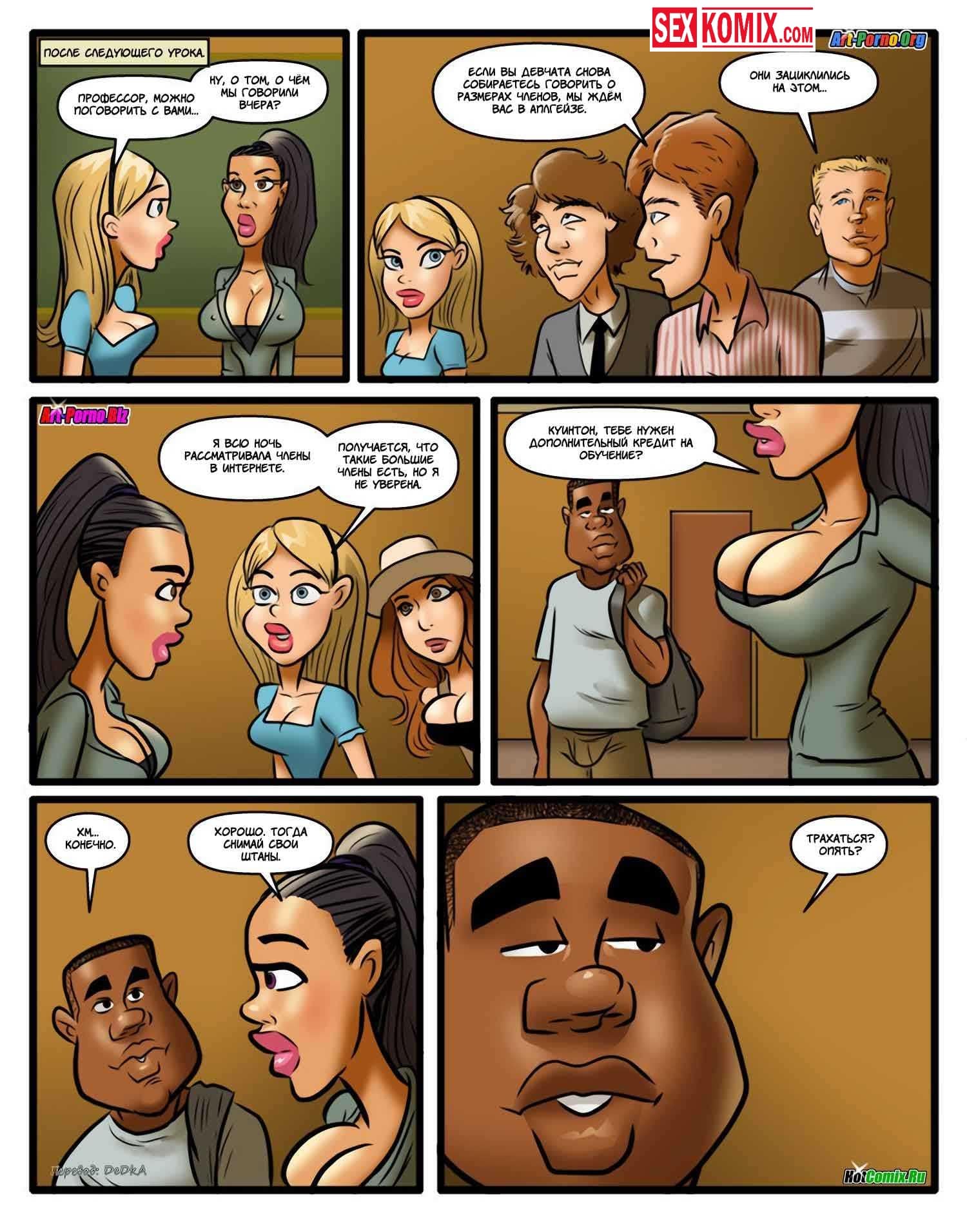Порно комикс Курсы использования чёрных членов. Девушки из колледжа для богатых постоянно встречаются с белыми парнями и даже не подозревали о том, что в мире существует большие члены. Одна из них увидела фотографию обнажённого парня с их университета и чуть не сошла с ума, от его огромного члена. Она показала это фото своим подругам, девушки возбудившись решили пойти на вечеринку для чернокожих, чтобы подцепить там парней и попробовать их огромные шланги внутри себя. Оказалось это проще простого, черные парни любят трахать белых цыпочек.