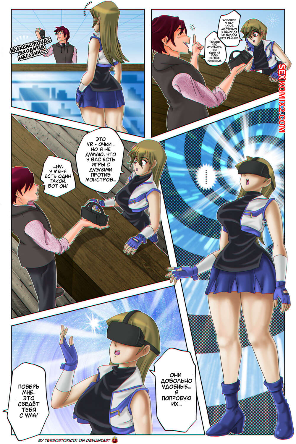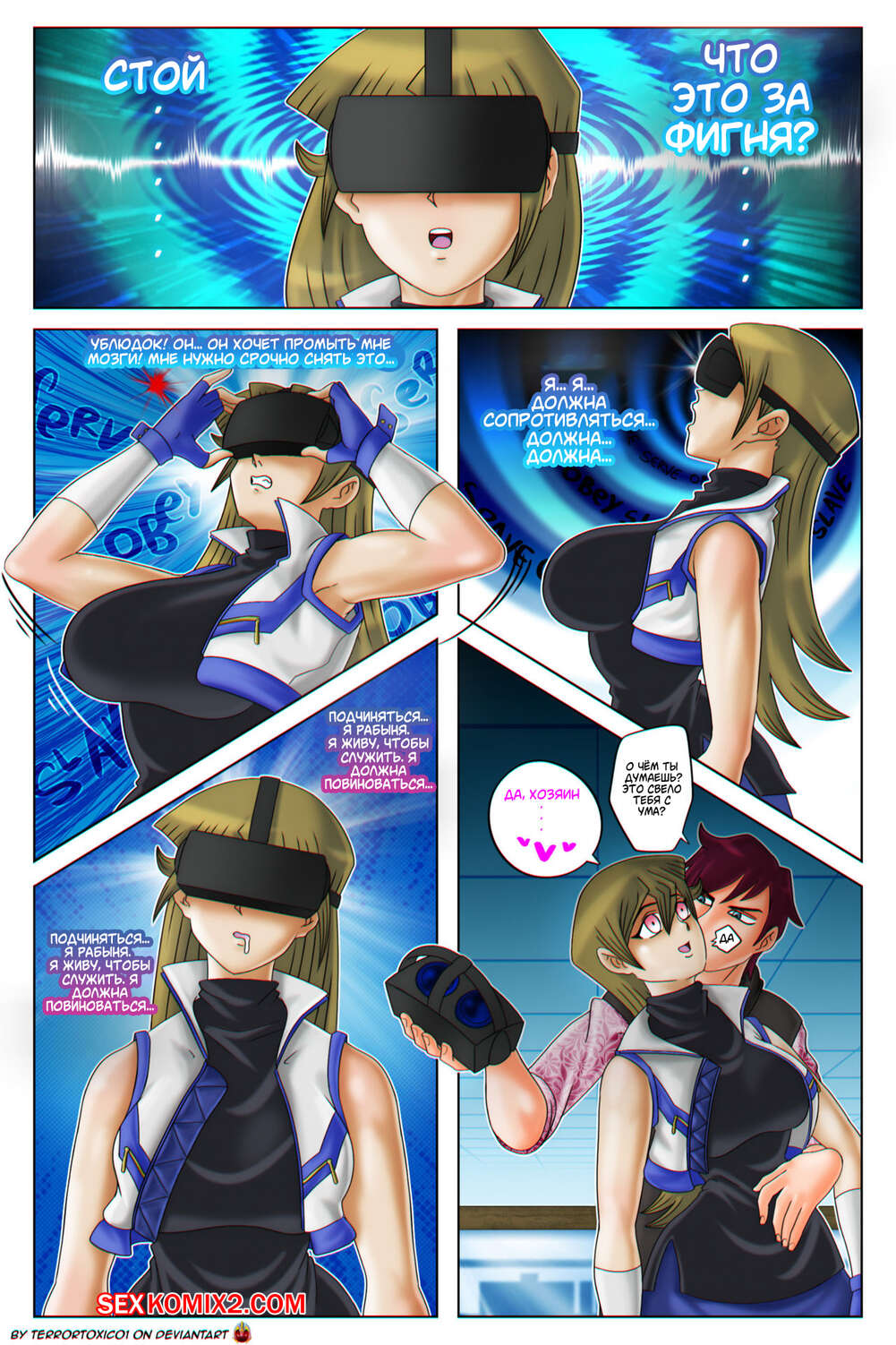 Порно комикс Тьма в ужасе души. Dark in the Soul Terror. Toxico. Yu Gi Oh GX Парнишка подкрался сзади к сисястой блондинке, застрявший в виртуальной реальности. Он снял с нее очки и предложил отведать его большого виртуального хуйца, что она с радостью и сделала.