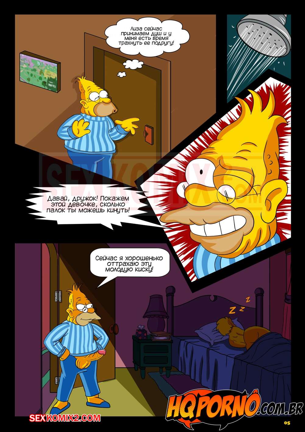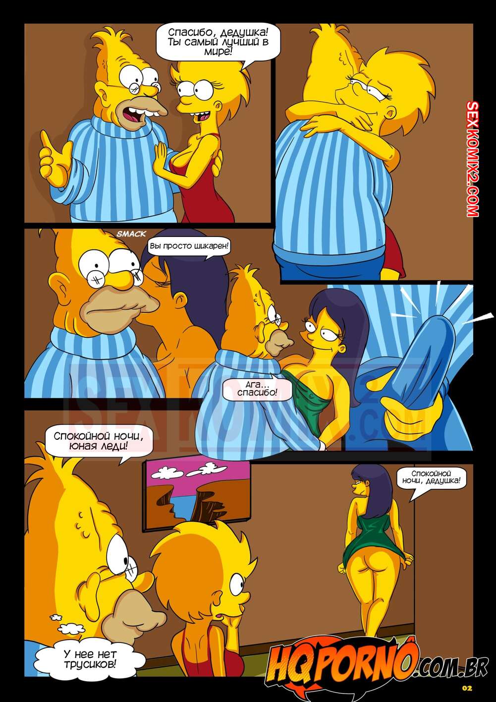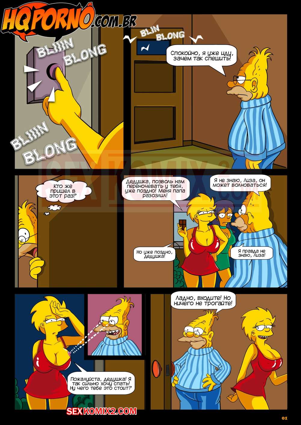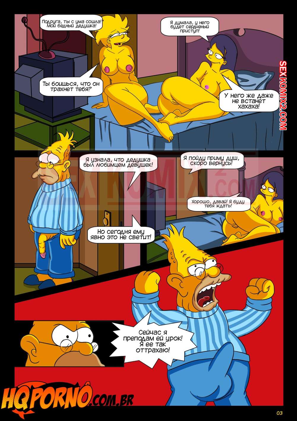 Порно комикс Симпсоны. Cпать в доме дедушки. Симпсексы. HQqporno Девушка пришла со своей подругой к дедушке, чтобы переночевать у него. Подруга стала прикалываться над возрастом дедушки, поэтому он решил ее хорошенько за это наказать. Он услышал, что его внучка уходит мыться, поэтому отправился в комнату к девушке и выебал ее хорошенько, но оказалось, что под ним была его внучка.