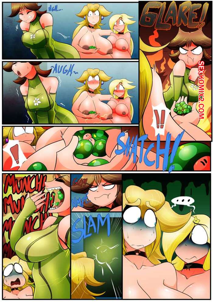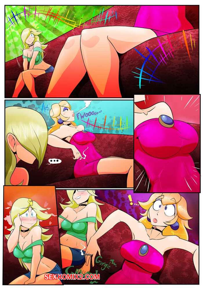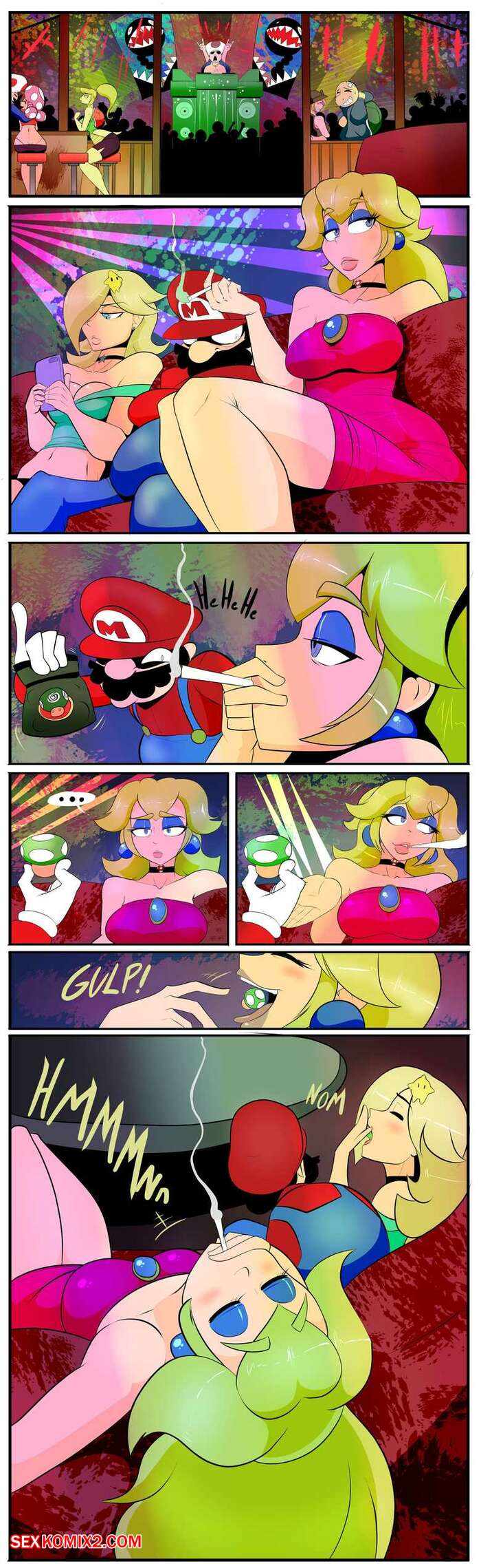 Порно комикс Марио. Вечеринка. Девушки отдыхали в ночном клубе, они попробовали странные грибы, от которых у них начал расти живот. Это возбудило красоток и они начали трахаться в туалете.