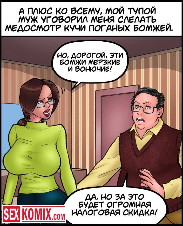 Порно комикс Доктор шлюха. Часть 1. С самого утра у сексуальной докторши день не заладился, все её раздражали, чистильщик бассейна ей нагрубил и на неё накричал какой-то парень. Когда она пришла на работу узнала, что сегодня ей предстоит осматривать мужчин и их члены на наличие заболеваний. Весь день перед её лицом мельтешили маленькие и ничем не приметные члены и женщина уже совсем поникла. А под вечер стали приходить чернокожие парни и настроение поднялось, их огромные члены вызывали сексуальный аппетит.