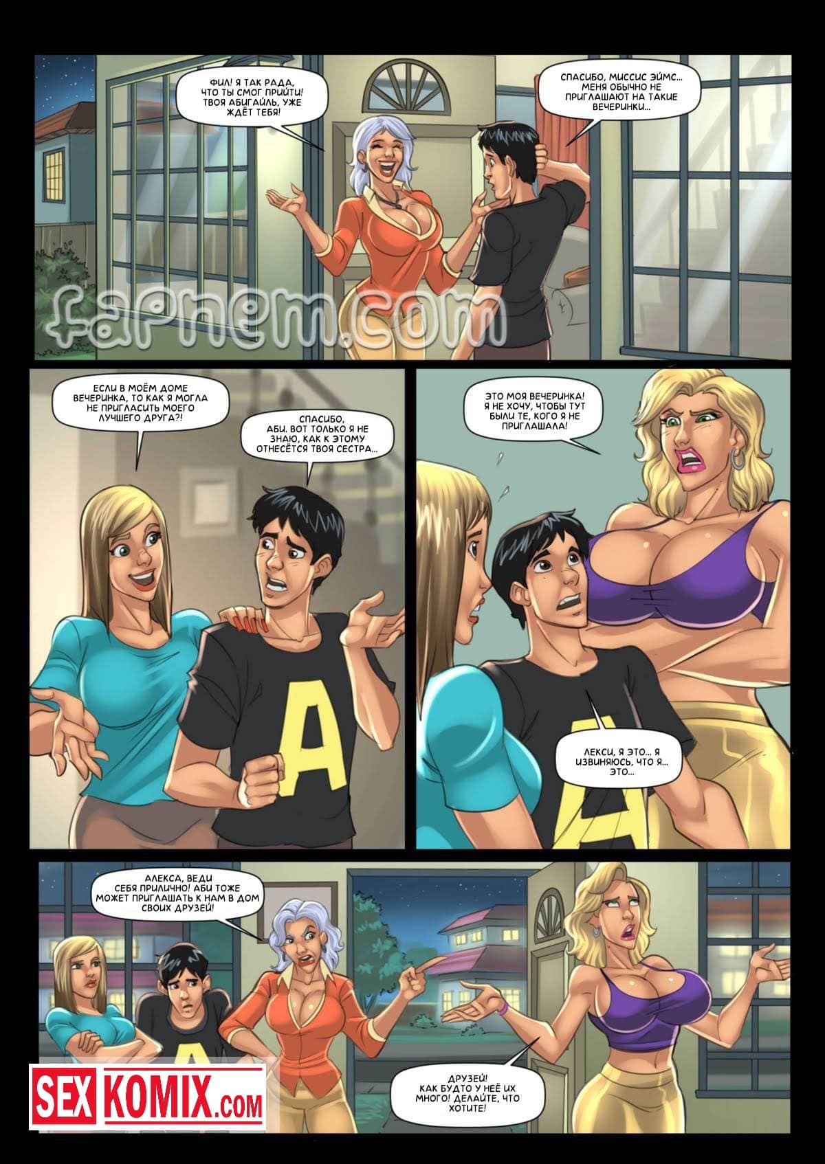 Порно комикс Необычная вечеринка. Часть 1. Этот секс комикс о том, как собравшись на вечеринке, парни и девушки решили хорошо провести время. Но вдруг что-то произошло и девушки начали превращаются в великанш. Их и без того большие сиськи начали становятся просто огромными. А парни так и остались в своем прежнем росте. Но это не помешало девушкам заняться с ними сексом. Так же они отлизывали друг у друга.