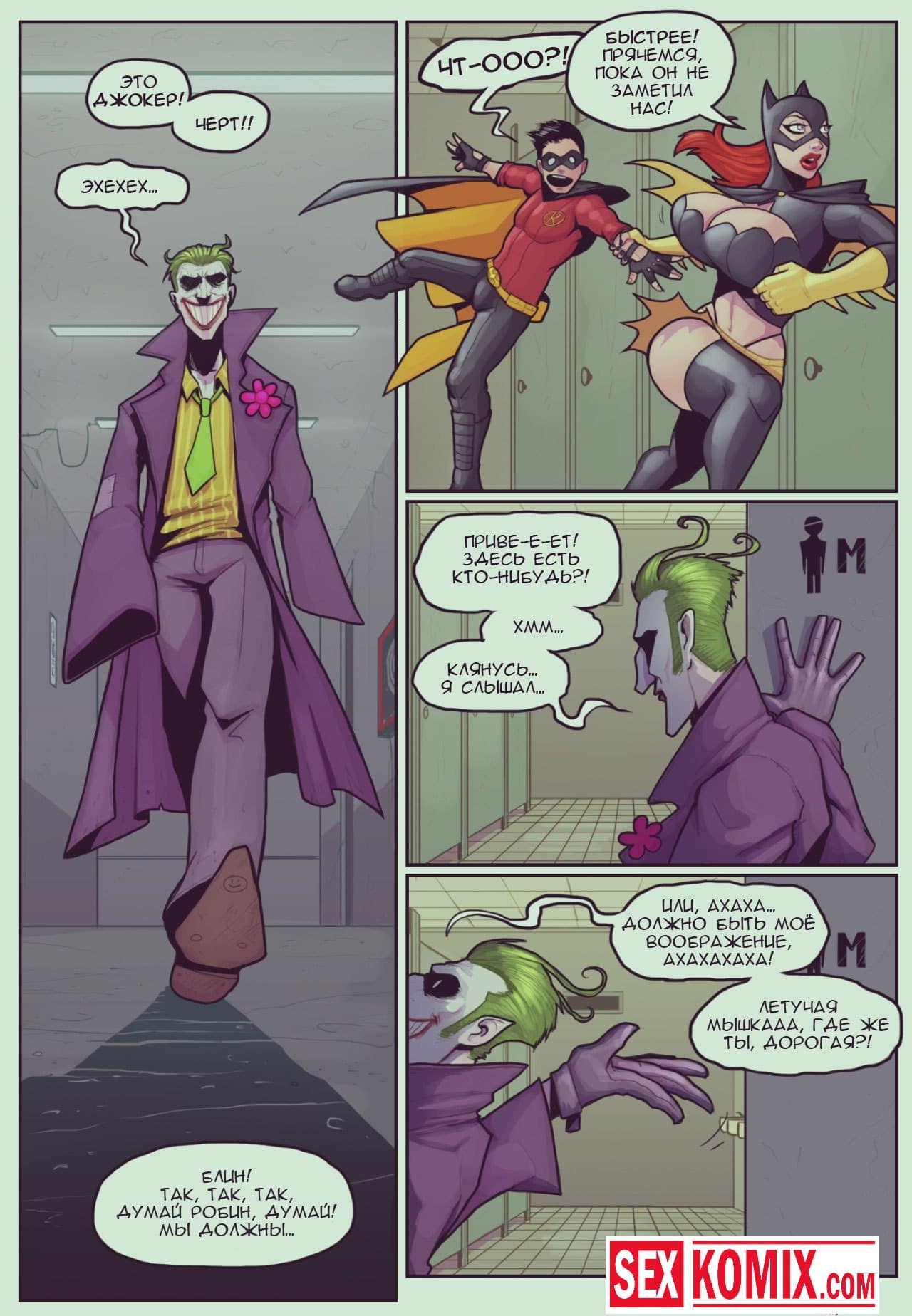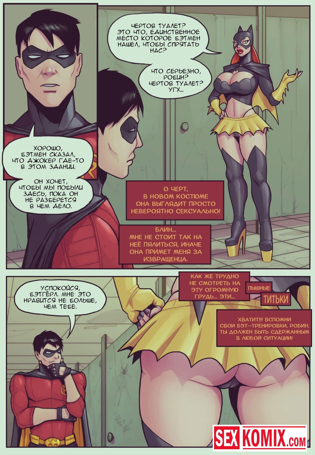 Порно комикс Загубленный Готэм. Бэтгерл совратила Робина. Бэтмен напал на след Джокера и ему срочно нужно было ехать на поимку этого преступника. Он дал задание Бэтгерл и своему помощнику Робину, чтобы они охраняли город в его отсутствие. Но вместо этого развратная девушка облазила Робина и занялась с ним горячим сексом. Два супергероя страстно трахались у Бэтмена пока тот выполнял свою работу. Но когда он вернулся с пойманным Джокером, обнаружил и двоих голыми.