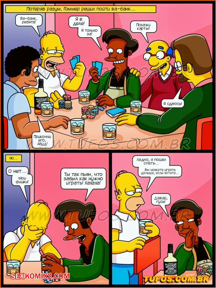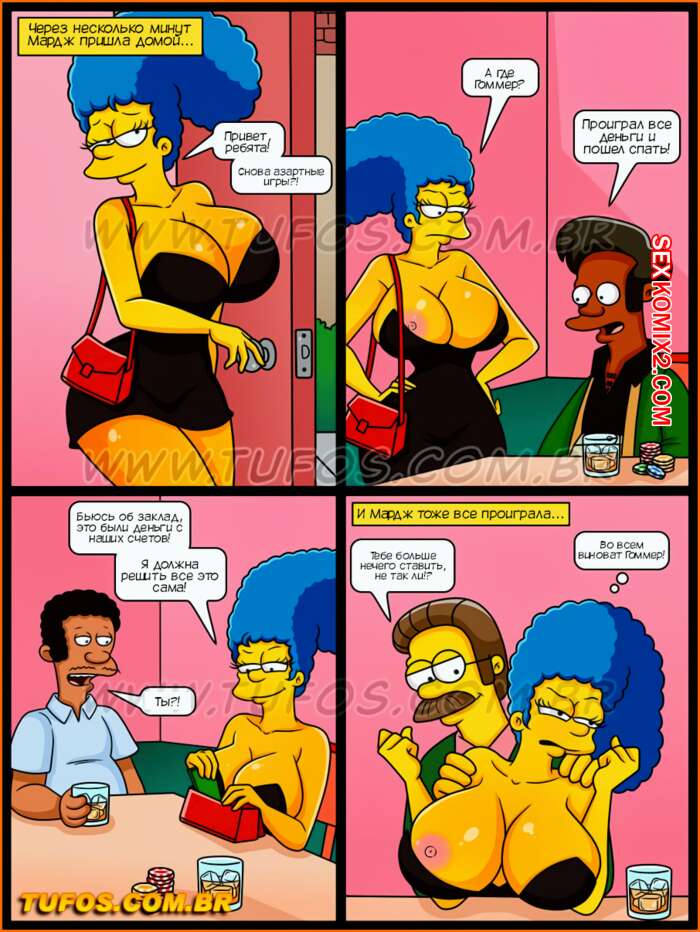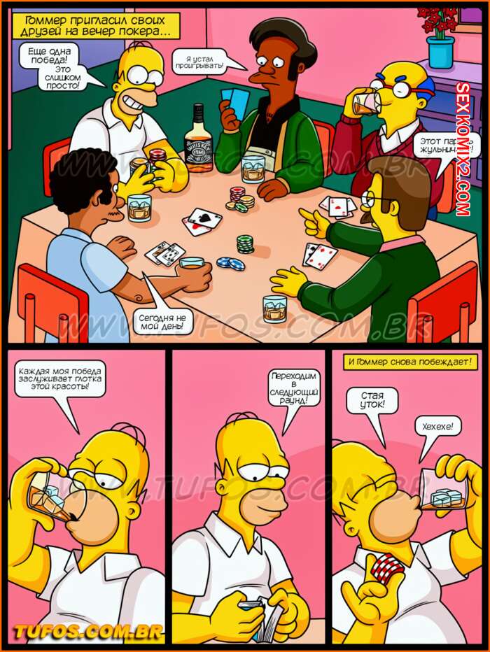 Порно комикс Симпсоны. Часть 39. На кону групповуха. Tufos Гомер пригласил своих друзей поиграть в покер и проиграл почти все семейные деньги. Мардж пришлось отыгрываться за него, но она тоже проиграла, поэтому ей пришлось заняться групповой еблей со всеми друзьями мужа.