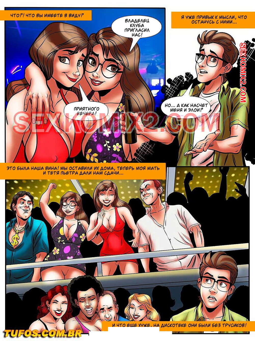 Порно комикс Лакомство заучки. Часть 19. В клубе без трусиков Две мамаши милфы отправились в клуб со своими сыновьями и даже не надели трусики. Они привлекли внимание двух парней, которые выебали сучек в пизду и задницу на глазах главного героя.