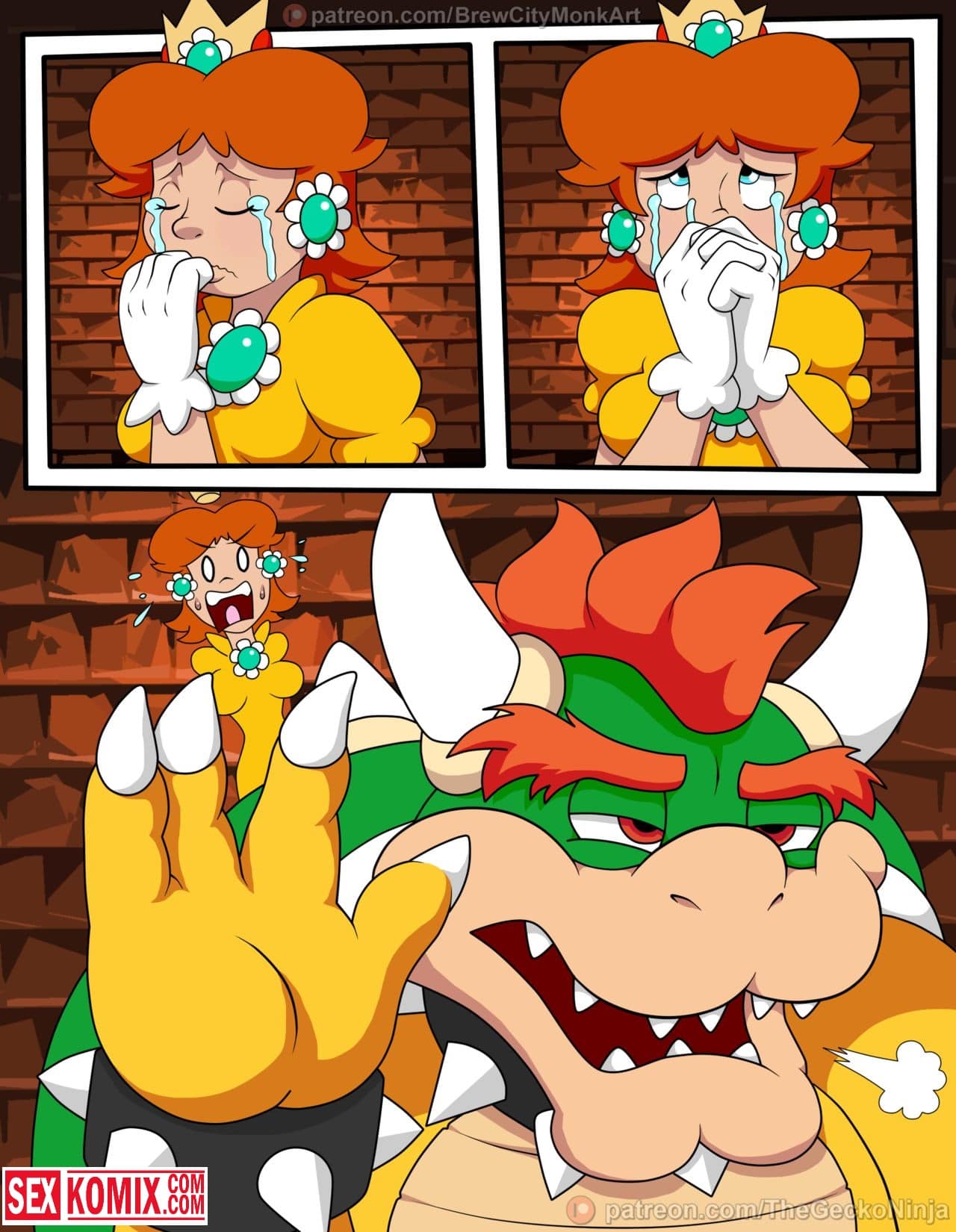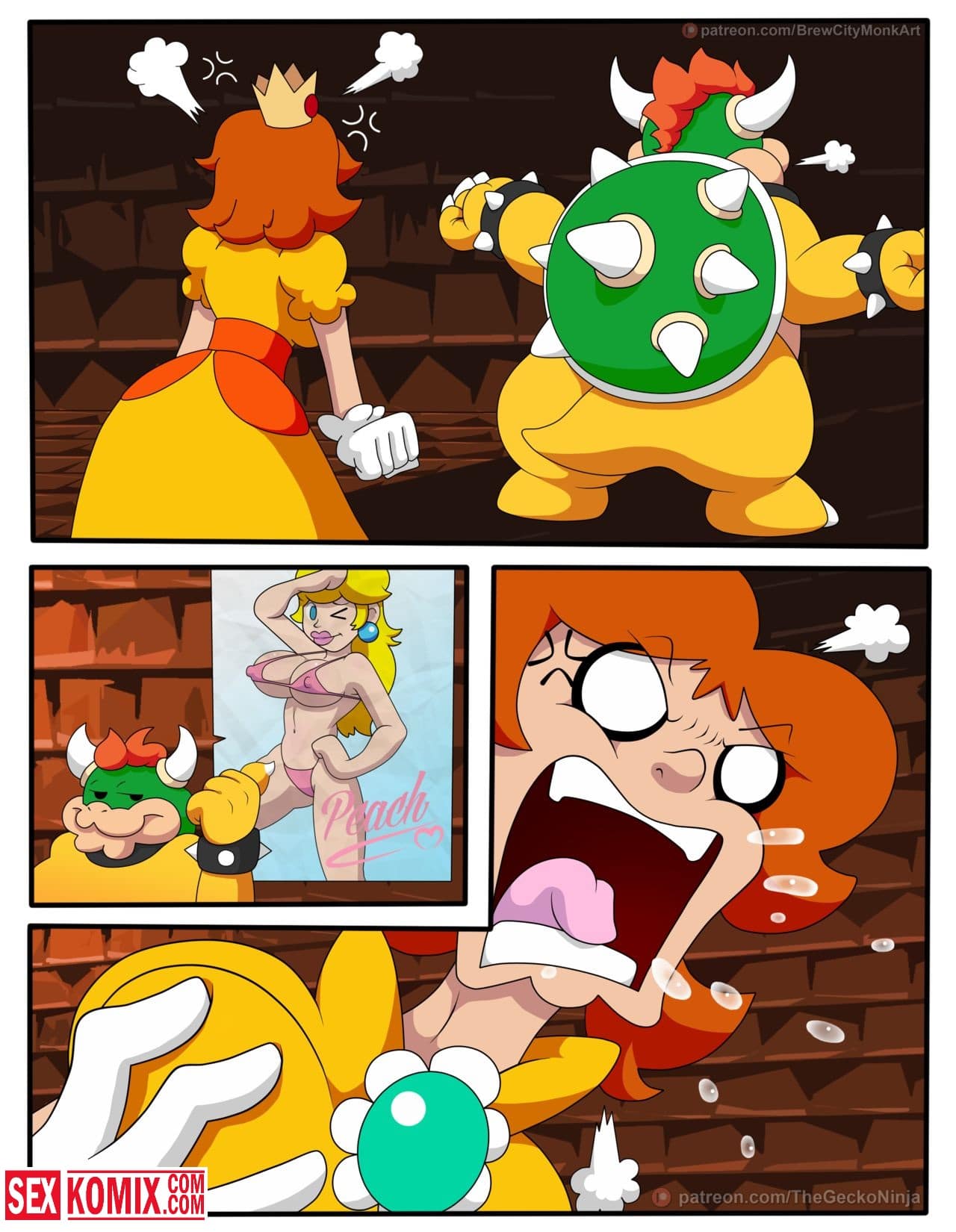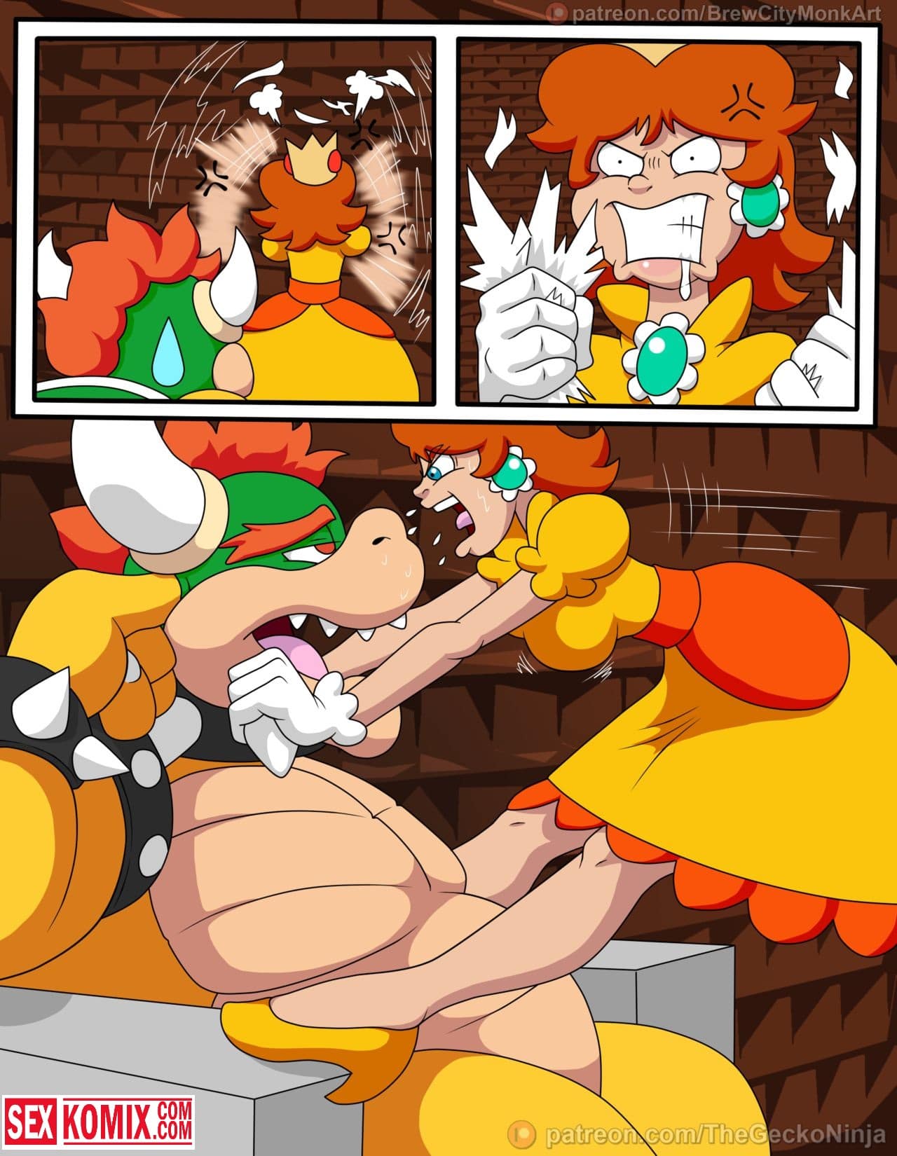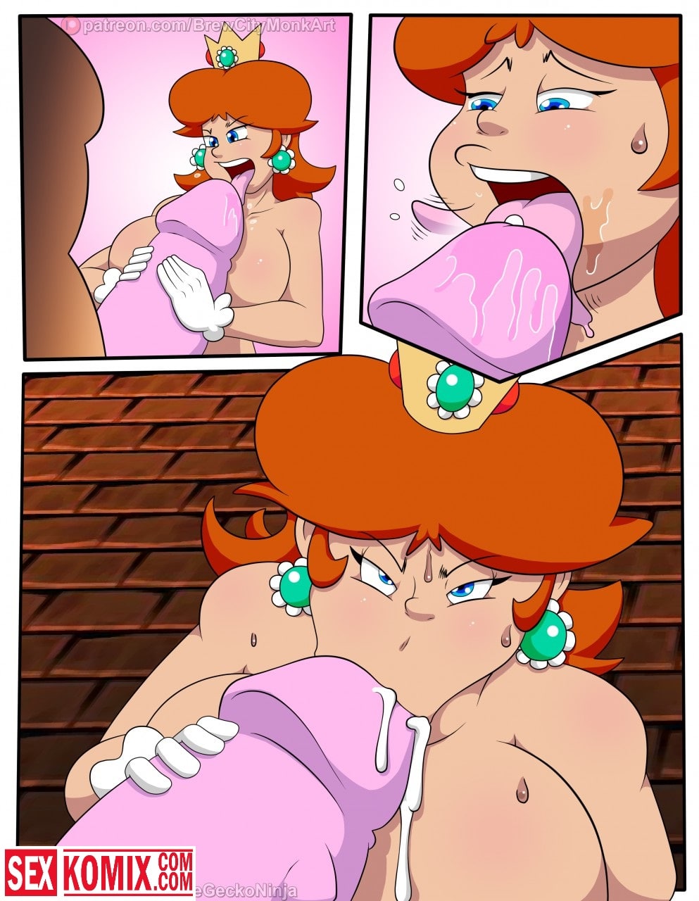 Порно комикс Принцесса шлюха. Лучшая подруга Марио попала в плен развратного дракона и его прислужников. Они уже давно мечтали о том, чтобы трахнуть её. Для этого и похитили, девушка сначала была против того, чтобы заниматься с ними сексом. Но потом вошла во вкус, и с радостью трахалась с самим драконом и с его охраной. Обрабатывая их сразу по несколько человек, когда её муж узнал о том, что она в заточении, было уже поздно. Спермой было залито всё её тело.