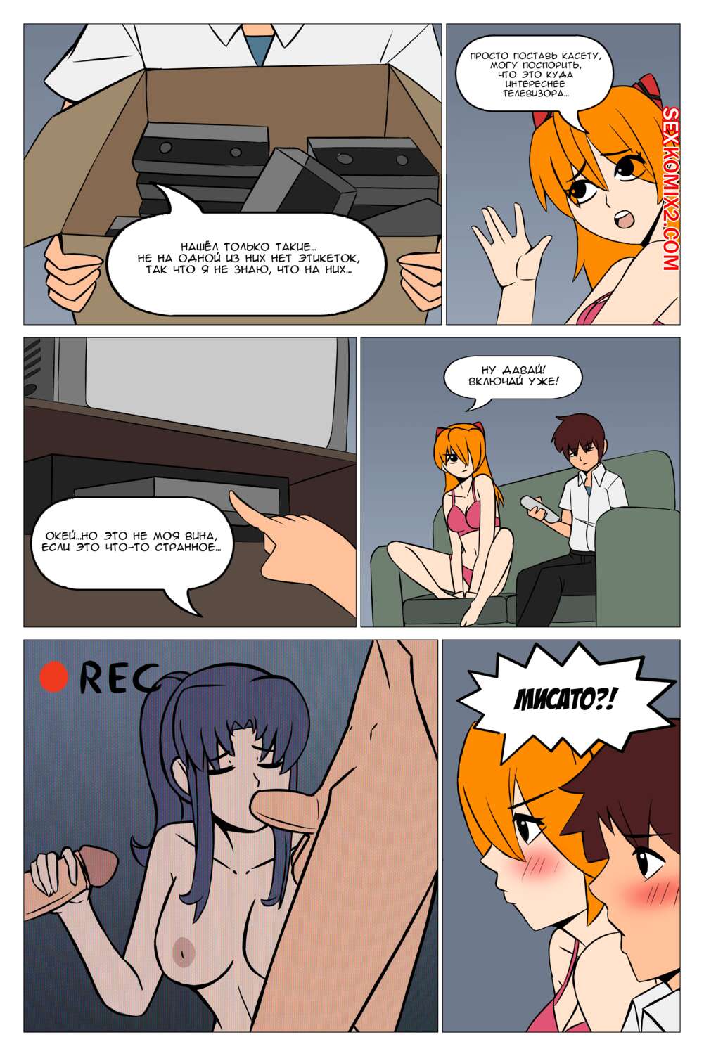 Порно комикс Neon Genesis Evangelion. Неверное видео. Wrong Video Горячая сисястая красотка смотрела со своим дружком порно и у него встал хуя. Красотка разделась и стала сосать большой хуй парня, после чего дала ему себя хорошенько выебать.