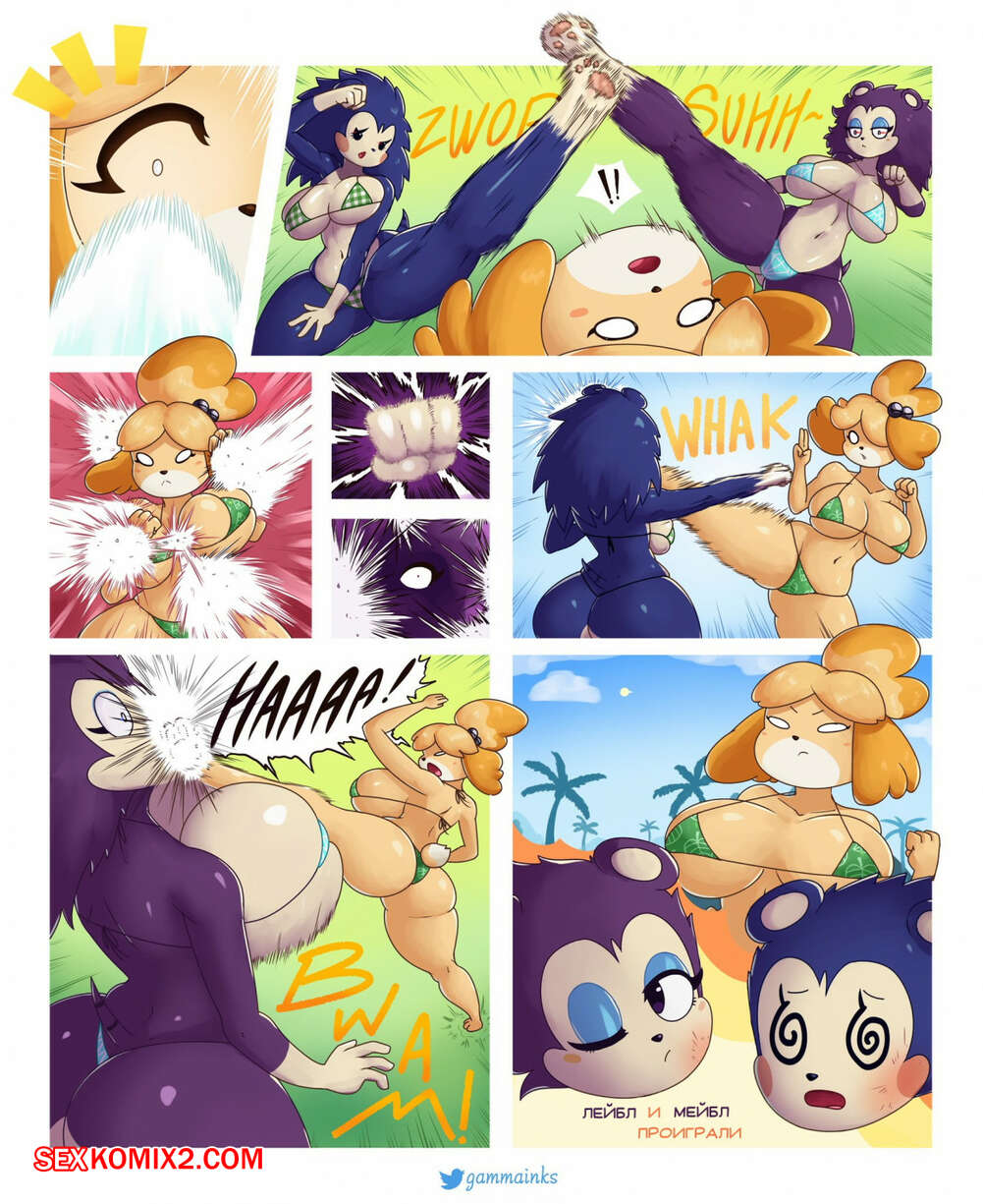 Порно комикс Вызов Изабель. Isabelle challenge. Animal Crossing Горячая сисястая красотка блондинка пришла на пляж в сексуальном купальнике. Она бросила вызов девушкам, которые стали с ней сражаться, но никому не удалось одолеть Изабель.