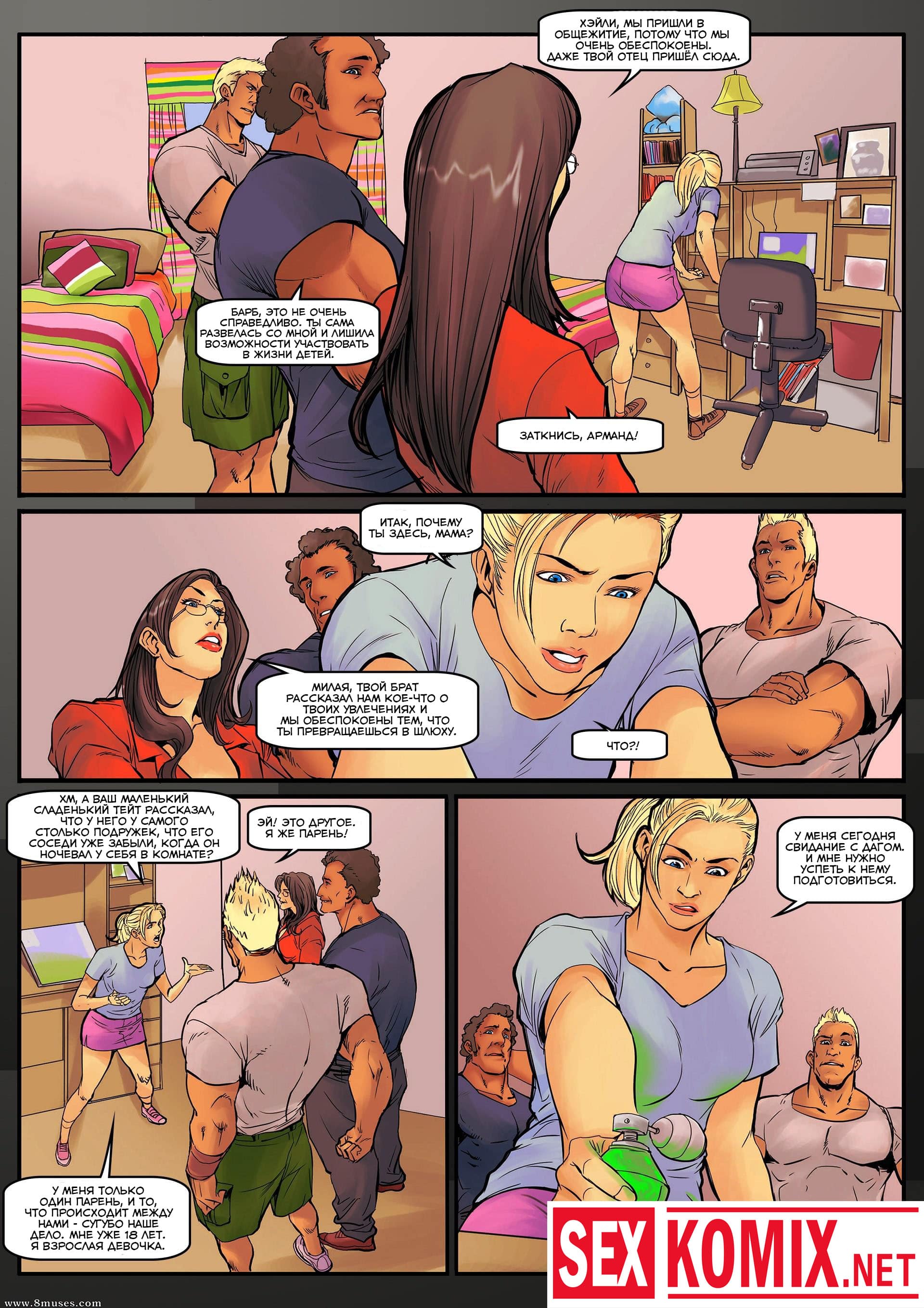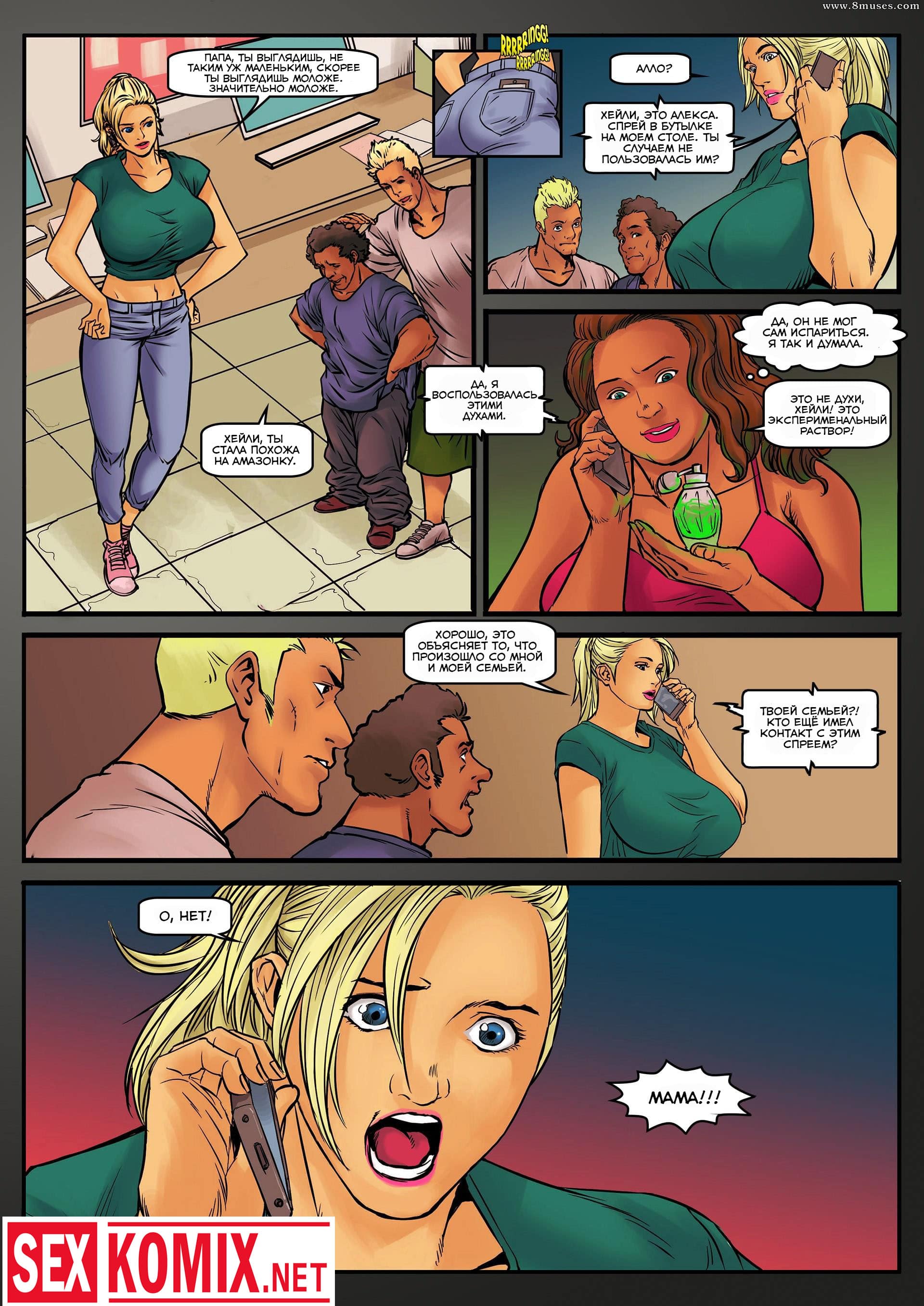 Порно комикс Я теперь большая девочка. Симпатичной блондинке попал в руки загадочный бутылек, а в нем была зеленая жидкость. Она хотела проверить, что в нем и брызнула на себя, но поскольку в комнате были ещё люди, на них этот эликсир тоже попал. Некоторое время спустя девушка поняла, что увеличивается в размерах и её грудь и задница начинают расти. Её парень приятно удивился этому и захотел трахнут красотку.