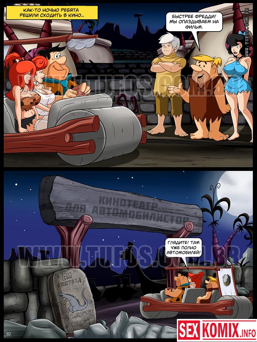 Порно комикс Флинстоуны. Страсть в кино. Две супружеские пары поехали смотреть кино в кинотеатре на улице. Они расположились у экрана и начали смотреть кино, но в машине было тесно и один из мужей почувствовал на него села своей нежной задницей жена его друга. Он мягкой попки он возбудился и его член встал. Не удержав свое желание мужчина достал член и вставил красотке пока никто не видит.